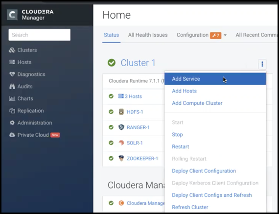 From your Cloudera Manager homepage, go to Status tab > $Cluster Name > ... > Add Service