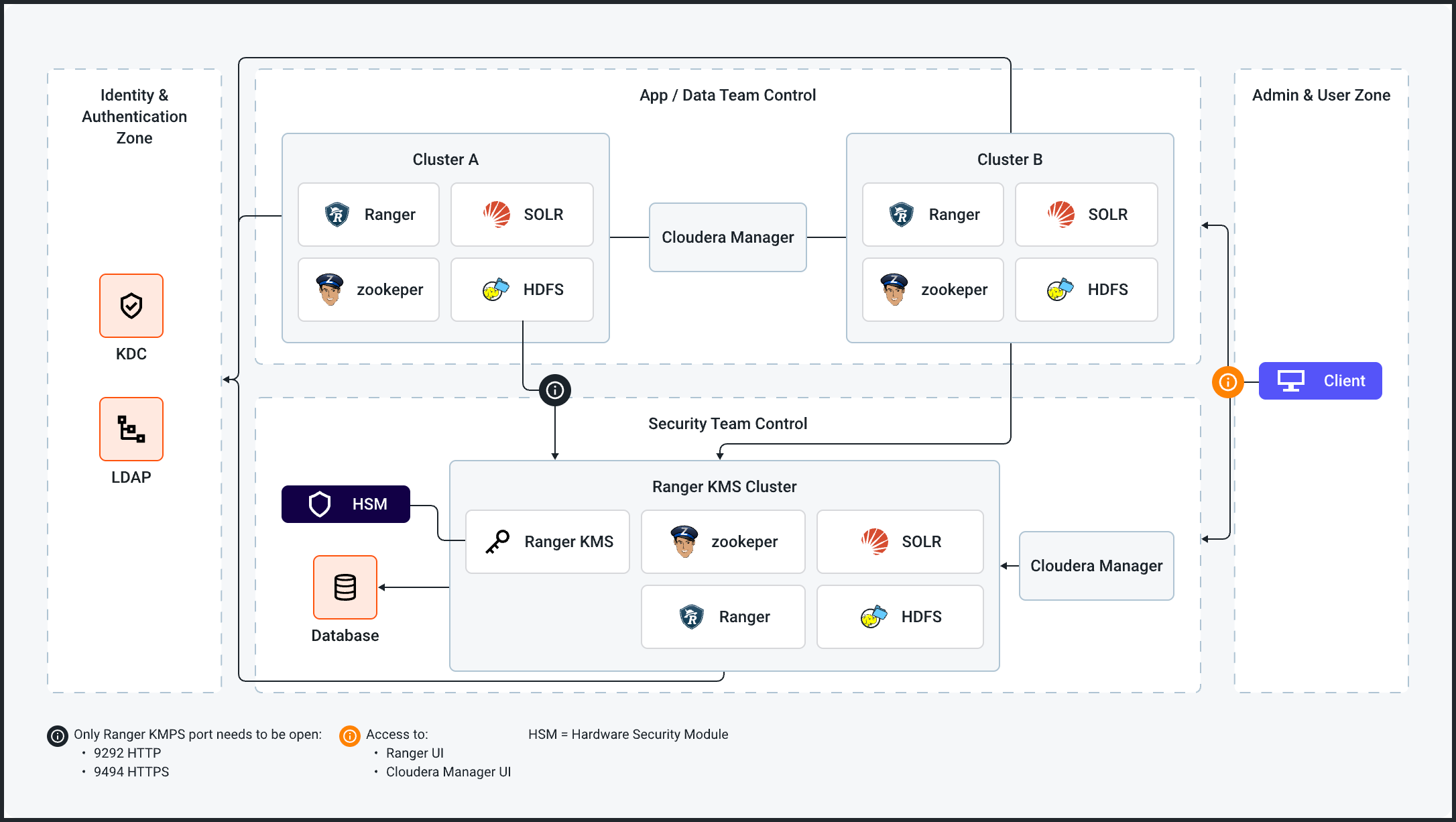 Application and data processing occur in a data cluster. The data cluster stores and processes actual datasets but does not directly manage encryption keys. Instead, a separately managed security cluster with the Ranger KMS service installed handles the key lifecycle operations, for example, generation, rotation, and storage. This separation of tasks enhances security by isolating the administration of the data cluster from the security cluster. Additionally, this architecture provides the following benefits: