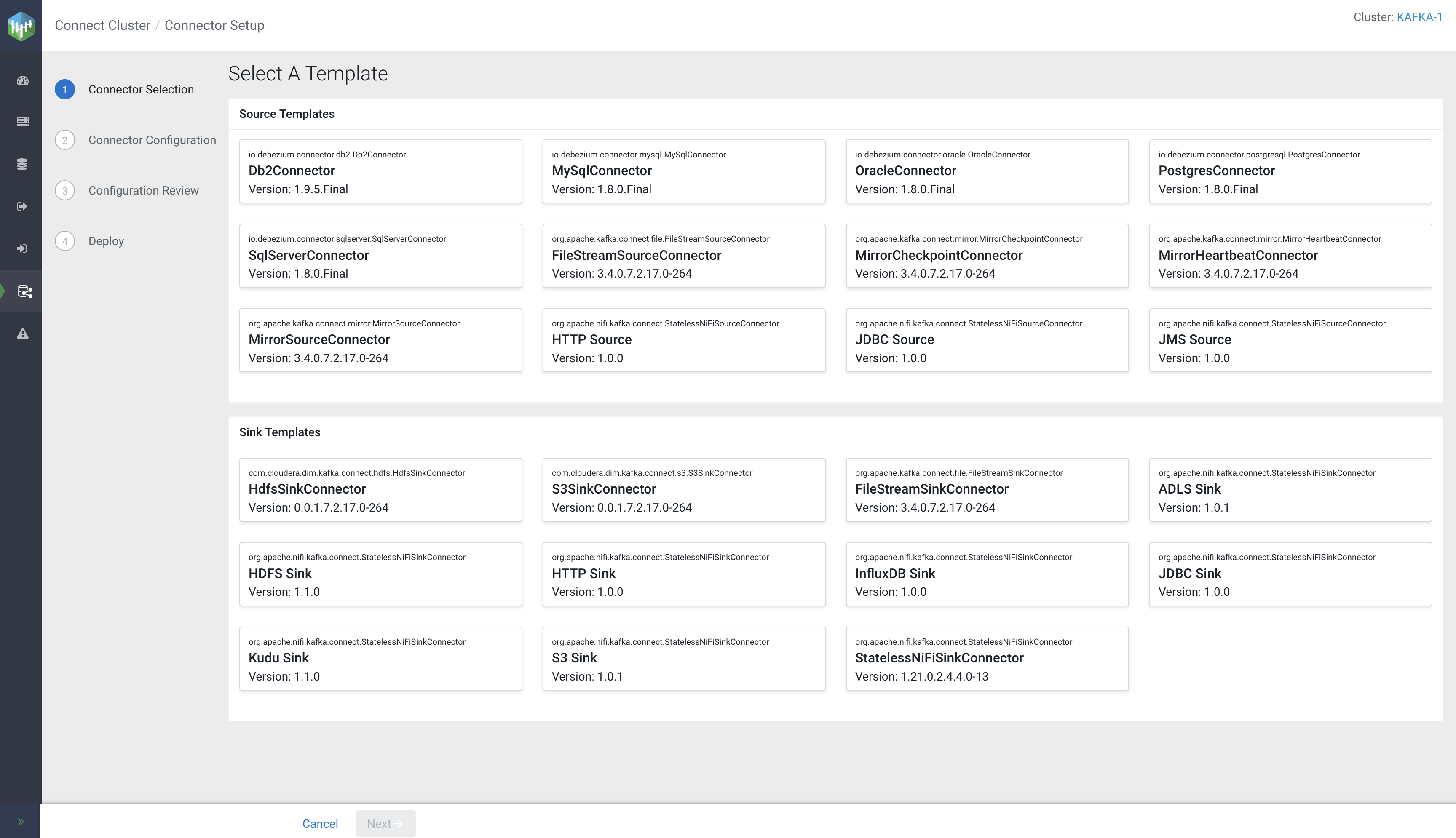 You can find a full list of the Stateless NiFi-based connectors in Connectors. In addition, you can also use the Streams Messaging Manager UI to check which of the connectors are Stateless NiFi-based. When adding a new connector using Streams Messaging Manager, you are presented with a number of cards that represents the connectors available for deployment. Each card includes the following information about the connector: