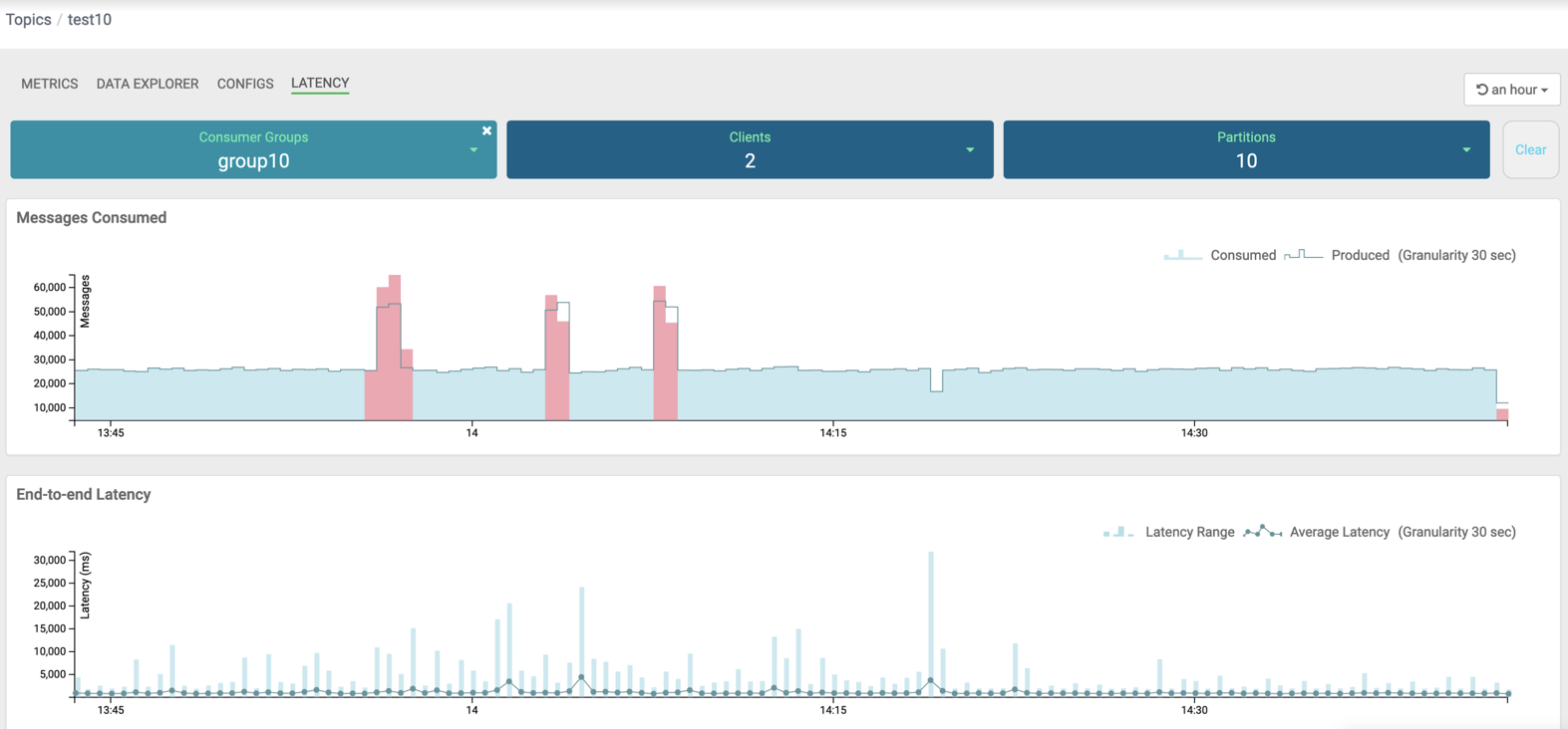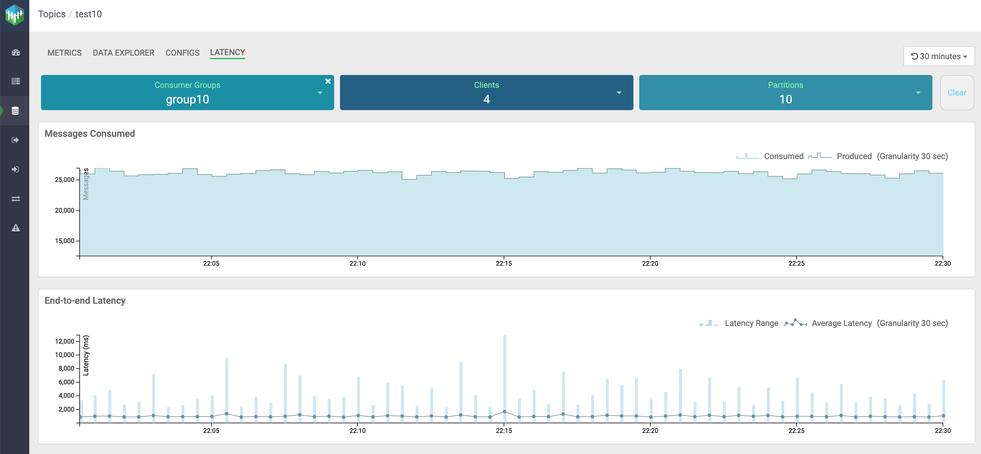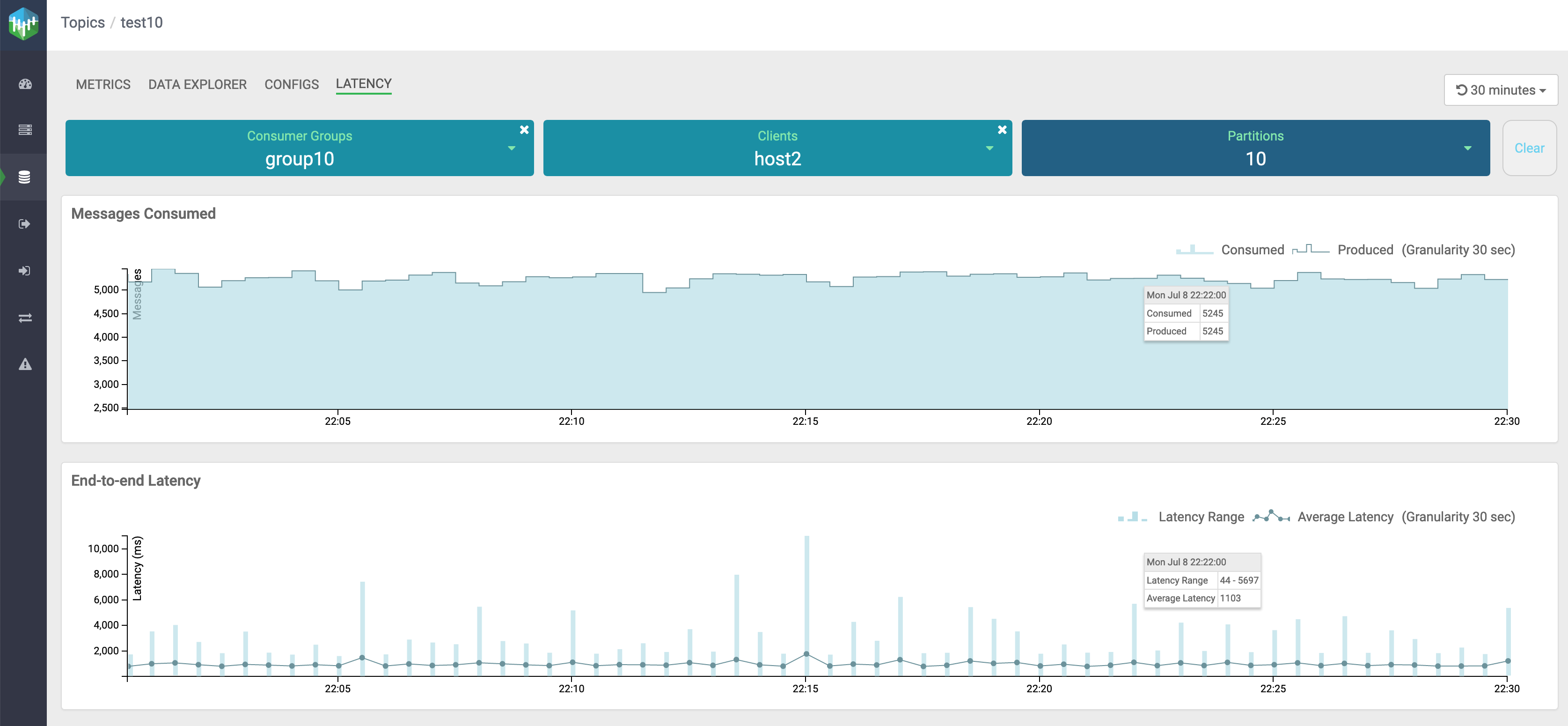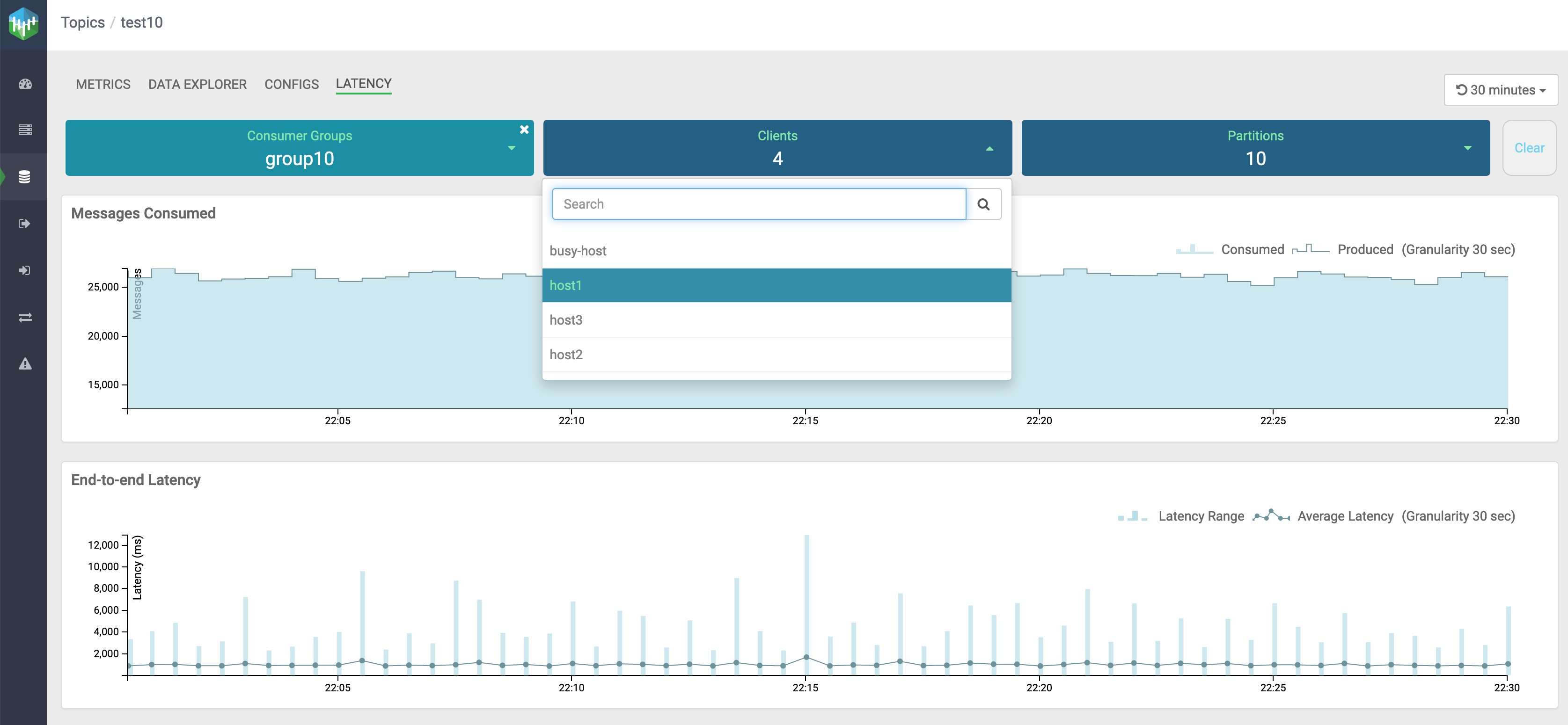 In the above image, you select group10 consumer group to inspect the latency and message counts for each client.