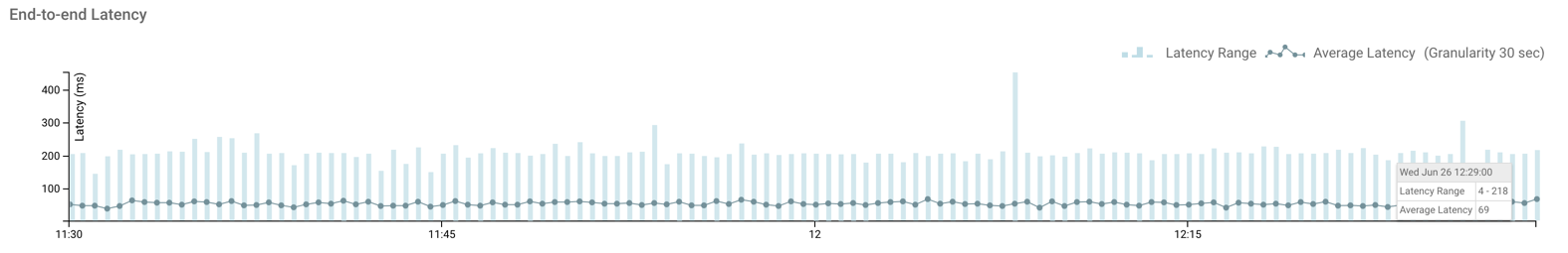 In the above image, the vertical lines represent the latency range, and the dotted line represents the average latency in consuming the produced messages in last one hour with a granularity of 30 seconds. You can see that at 12:29:00 hours on Wed Jun 26, the latency range was between 4 - 218 milliseconds and the average latency was 69 milliseconds.