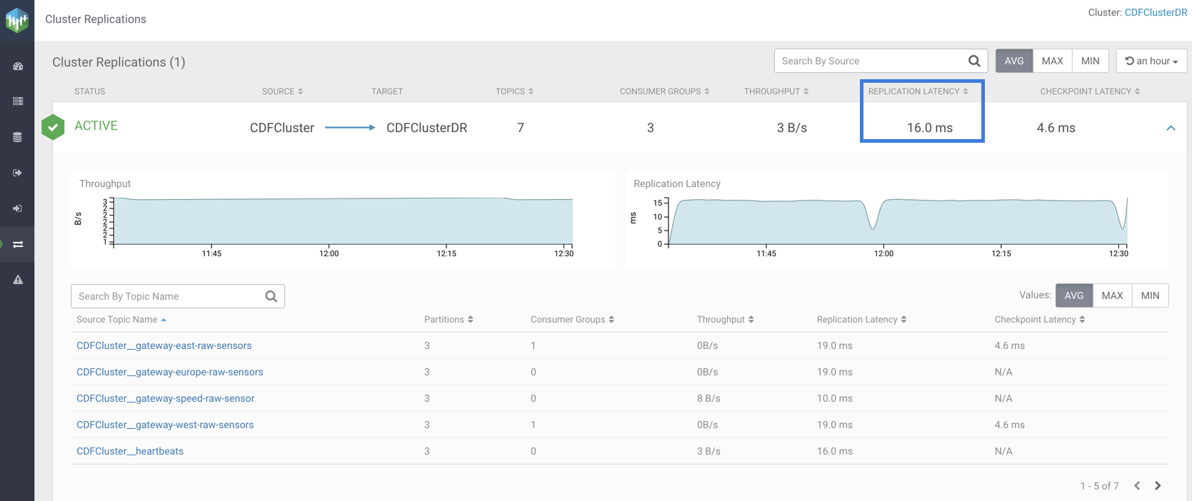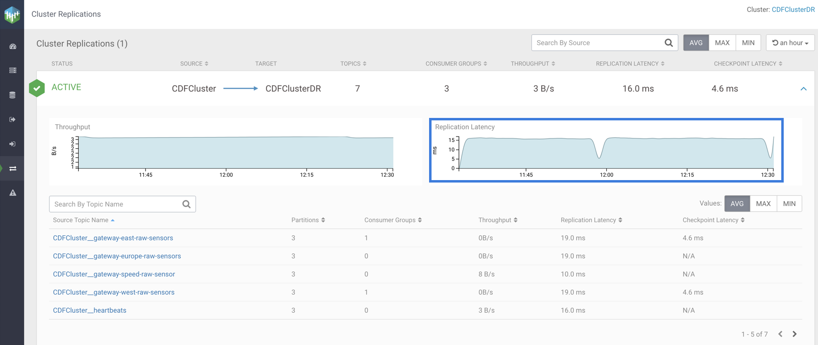 In the image, you can see the average replication latency for the CDFCluster to CDFClusterDR replication is 16.0 milliseconds. You can fetch the maximum or minimum replication latency for the replication by clicking the MAX or MIN button located above the cluster replication.