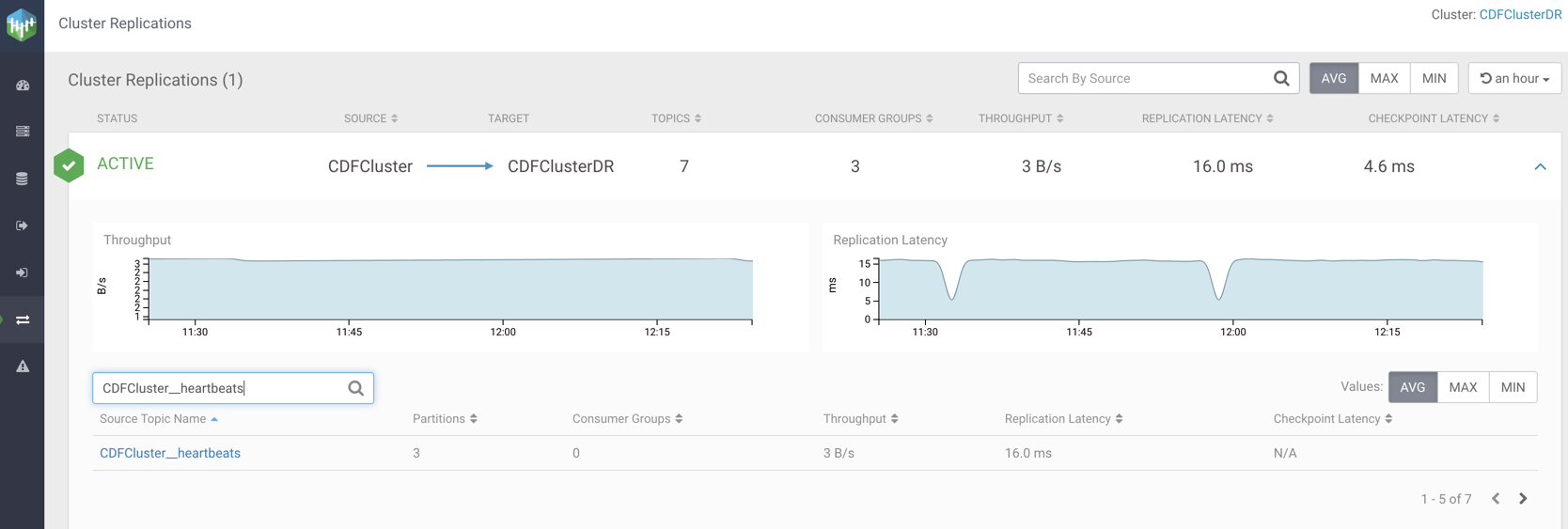 You can use the Search By Topic Name bar to search a Kafka topic by name and get details of that topic. The following image shows details of the CDFCluster__heartbeats topic: