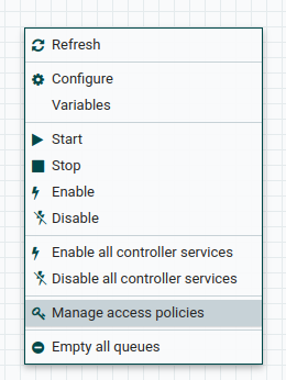 Policy Privilege view the component Allows users to view component configuration details modify the component Allows users to modify component configuration details view provenance Allows users to view provenance events generated by this component view the data Allows users to view metadata and content for this component in FlowFile queues in outbound connections and through provenance events modify the data Allows users to empty FlowFile queues in outbound connections and submit replays through provenance events view the policies Allows users to view the list of users who can view and modify a component modify the policies Allows users to modify the list of users who can view and modify a component retrieve data via site-to-site Allows a port to receive data from NiFi instances send data via site-to-site Allows a port to send data from NiFi instances -