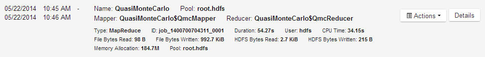 yarn jar /opt/cloudera/parcels/CDH/lib/hadoop-mapreduce/hadoop-mapreduce-examples.jar pi 10 100