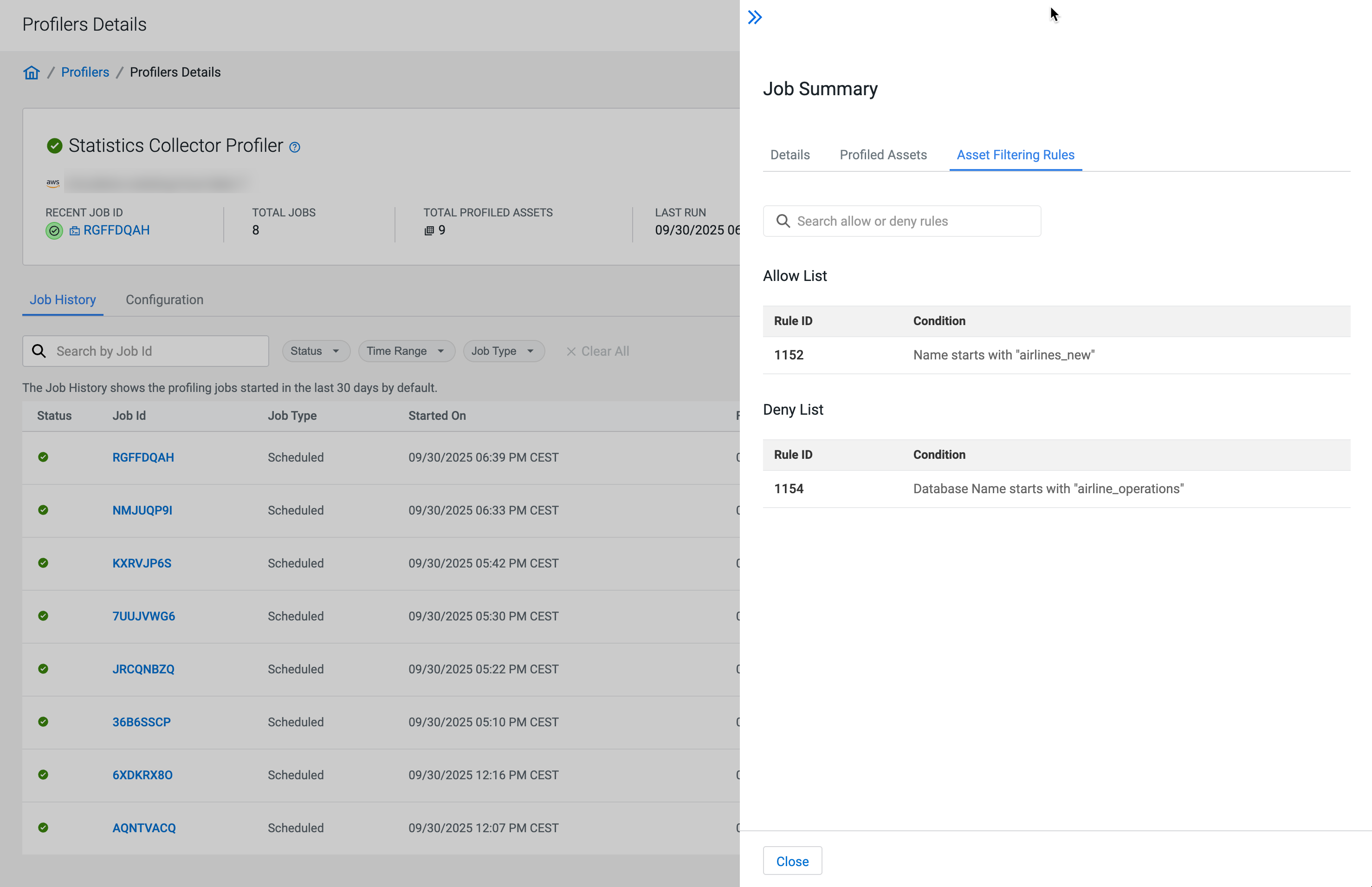 Job Summary shows the asset filtering rules applied for the particular profiling job: