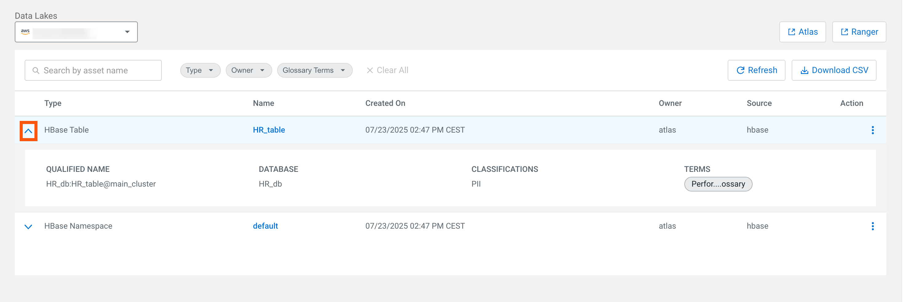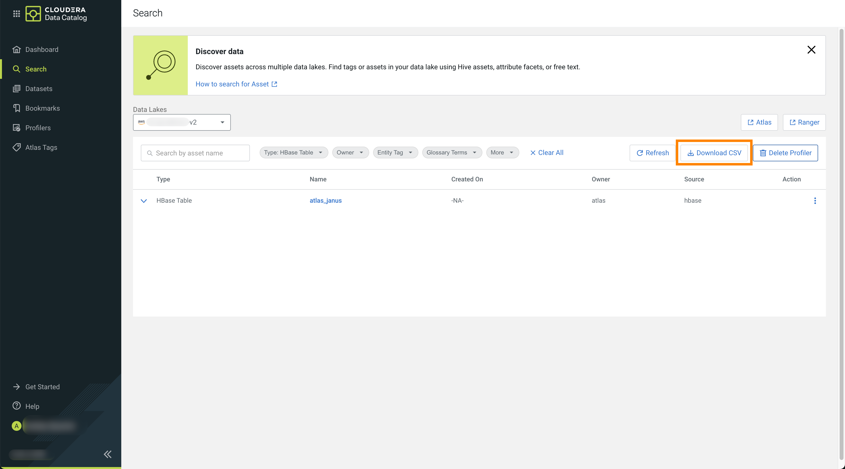 On the Cloudera Data Catalog Search page, select a data lake and enter a search string in the search box to view all the assets with details that contain the search string.